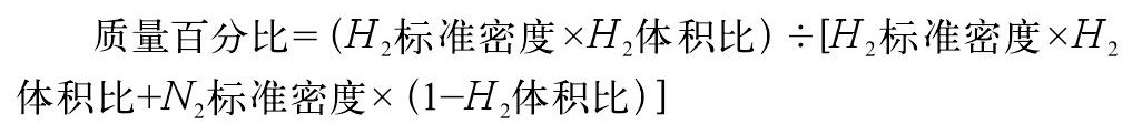 质量流量计1出现误差的原因是混合气体的质量, 因此需要按照质量百分比对其进行换算。首先需要按照分析仪体积的百分数来计算出氢气的百分比, 所采用的公式如下:
