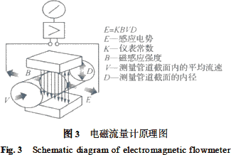 电磁流量计是基于法拉第电磁感应定律制成的测量导电性液体的仪表,如图3所示。即利用电磁感应原理来测量导管中导电液体的平均流速。