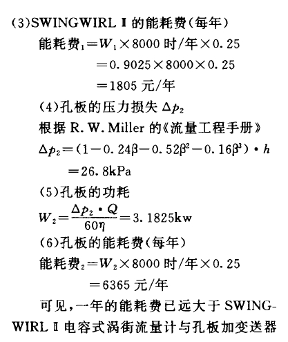 4. 3、减少压力损失节约能耗带来的效益。 由于仪表的压力损失会导致能量损失,而SWINGWIRL d的压损较小,因而能耗也小,下面举例与孔板相比较。 〔例〕已知条件:38℃的水、流量342m3/h。选用(1)SWINGWIRL d电容式涡街流量计,DN200口径;<2)节流孔板俘= 0. 689h = 50kPa如果泵与电动机的效率为8000.每千瓦时电费为0. 25元。